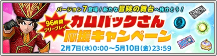 しばらく冒険から離れていた「カムバックさん」を、96時間フリープレイ&特典アイテムで応援します!※2024/3/22 「96時間フリープレイに関するご注意」に情報を追加しました。詳しくは 『 こちら 』 をご覧ください。