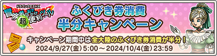 終了:23:59まで 冒険者のおでかけ超便利ツール ふくびき券消費 半分キャンペーン!